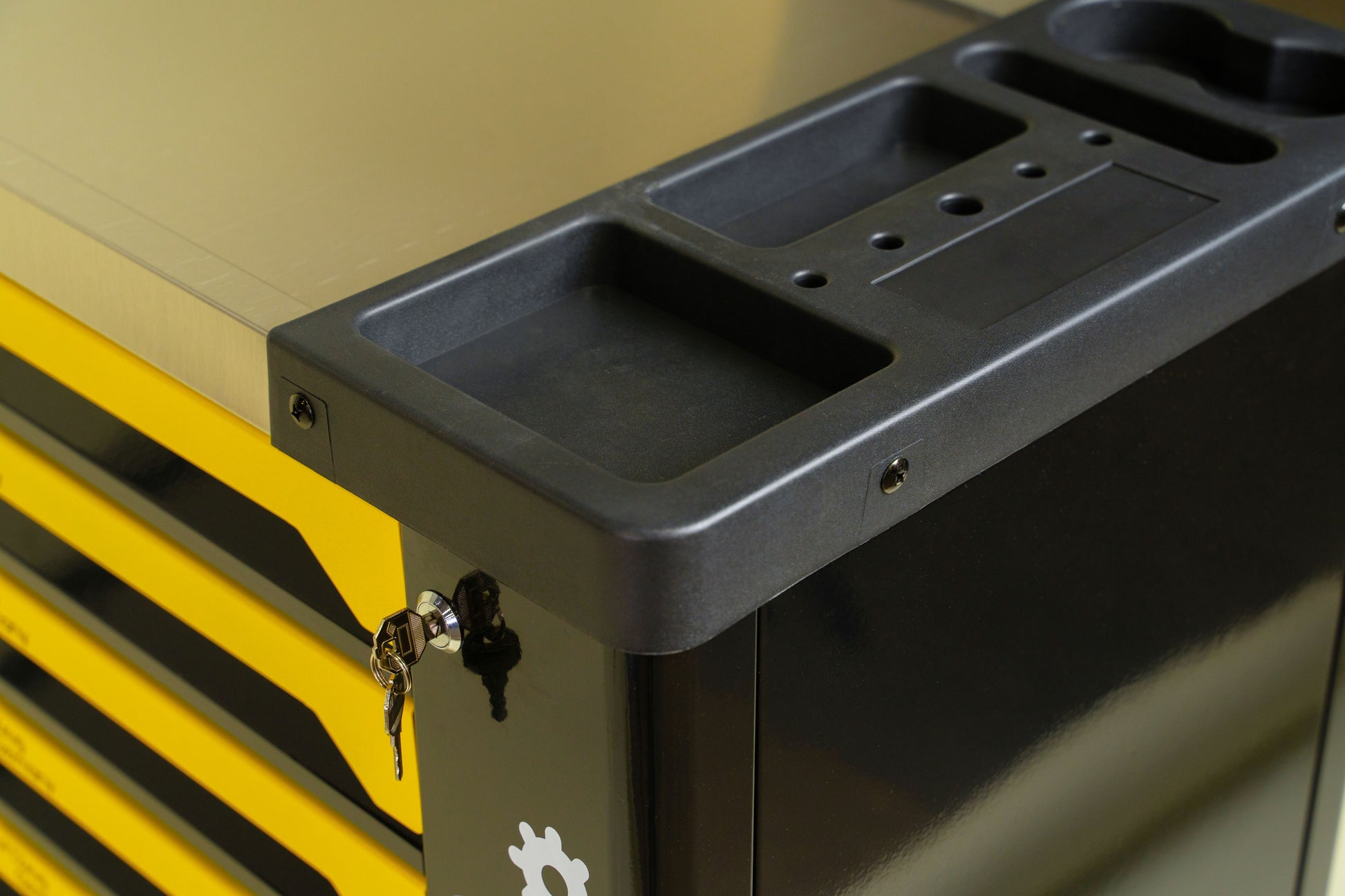 Unlock the full potential of your workspace with our comprehensive tool set. From Sockets and Impact Sockets to Screwdrivers & Combination Wrenches, Pliers, Hammers, Chisels, and Files, we've got you covered for every task. Crafted with robust all-steel construction and fortified with heavy-duty casters, our tool storage solution is built to endure. Featuring Ball-Bearing drawers equipped with soft-close latching mechanisms, say goodbye to noisy drawer closures. Our industrial-grade design ensures reliability for all your garage or workshop endeavors. Experience the convenience of centralized tool storage with added security measures. Keep your tools safe and organized with our lock function, preventing any chance of misplacement. Invest in efficiency, durability, and peace of mind with our all-in-one tool storage solution.